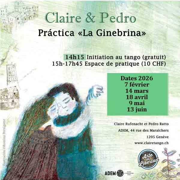 Le Musée d’art et d’histoire de Genève (MAH) ouvre ses portes aux ateliers thérapeutiques « Tango&Santé » en automne 2025: un cadre exceptionnel pour bénéficier d’ateliers thérapeutiques mêlant la danse du tango argentin et la découverte d’oeuvres d’art. Ils s’adressent aux personnes souffrant de troubles neurologiques (Parkinson, Alzheimer, post-AVC et autres maladies du mouvement) et leurs proches-aidants. Inscription obligatoire: INFOS Cet atelier invite les danseuses et danseurs de tango de tout niveau à explorer la richesse musicale du tango argentin, tant à travers son histoire que dans sa forme, afin d’enrichir sa danse et sa culture. Cours de 18h15 à 19h30 (30.-CHF) Concert dansant et milonga avec DJ à l’Espace Grosselin Cet atelier invite les danseuses et danseurs de tango de tout niveau à explorer la richesse musicale du tango argentin, tant à travers son histoire que dans sa forme, afin d’enrichir sa danse et sa culture. Cours de 18h15 à 19h30 (30.-CHF) Une Práctica est un espace pour danser le tango de manière détendue et confortable. Précédée d’une initiation gratuite au tango de 14h15 à 15h. Le Musée d’art et d’histoire de Genève (MAH) ouvre ses portes aux ateliers thérapeutiques « Tango&Santé » en automne 2025: un cadre exceptionnel pour bénéficier d’ateliers thérapeutiques mêlant la danse du tango argentin et la découverte d’oeuvres d’art. Ils s’adressent aux personnes souffrant de troubles neurologiques (Parkinson, Alzheimer, post-AVC et autres maladies du mouvement) et leurs proches-aidants. Inscription obligatoire: INFOS Concert dansant par: Alejo de los Reyes et Paula Serrano, à l’Espace Grosselin Le Musée d’art et d’histoire de Genève (MAH) ouvre ses portes aux ateliers thérapeutiques « Tango&Santé » en automne 2025: un cadre exceptionnel pour bénéficier d’ateliers thérapeutiques mêlant la danse du tango argentin et la découverte d’oeuvres d’art. Ils s’adressent aux personnes souffrant de troubles neurologiques (Parkinson, Alzheimer, post-AVC et autres maladies du mouvement) et leurs proches-aidants. Inscription obligatoire: INFOS …Y su Orquesta quartette en concert et milonga! Caves de Versoix Dans le cadre de la journée des ADEM « Au fil des danses et musiques du monde » sur le Bateau Genève. Le DUO R&R donnera un concert et une démonstration de Tango argentin. Dimanche 14 septembre | Quai Gustave-Ador 1, 1207 GenèveTango&Santé au Musée