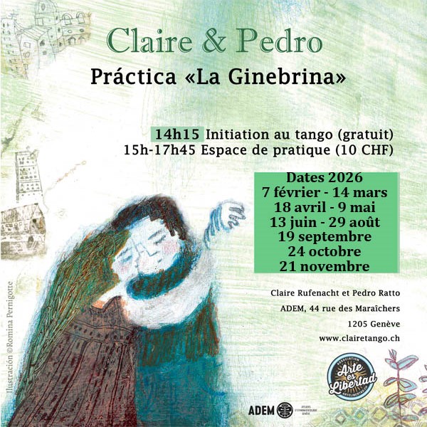 Deprecated shortcode. Use NOCHE LUNFARDA avec le duo RATTO-POUYÉ Cet atelier invite les danseuses et danseurs de tango de tout niveau à explorer la richesse musicale du tango argentin, tant à travers son histoire que dans sa forme, afin d’enrichir sa danse et sa culture. Lundi 16 février cours de Milonga 18h15 à 19h30 (30.-CHF) Le Musée d’art et d’histoire de Genève (MAH) ouvre ses portes aux ateliers thérapeutiques « Tango&Santé » en automne 2025: un cadre exceptionnel pour bénéficier d’ateliers thérapeutiques mêlant la danse du tango argentin et la découverte d’oeuvres d’art. Ils s’adressent aux personnes souffrant de troubles neurologiques (Parkinson, Alzheimer, post-AVC et autres maladies du mouvement) et leurs proches-aidants. Inscription obligatoire: INFOS Le Musée d’art et d’histoire de Genève (MAH) ouvre ses portes aux ateliers thérapeutiques « Tango&Santé » en automne 2025: un cadre exceptionnel pour bénéficier d’ateliers thérapeutiques mêlant la danse du tango argentin et la découverte d’oeuvres d’art. Ils s’adressent aux personnes souffrant de troubles neurologiques (Parkinson, Alzheimer, post-AVC et autres maladies du mouvement) et leurs proches-aidants. Inscription obligatoire: INFOS Concert dansant et milonga avec DJ à l’Espace Grosselin Afterwork « Rendez-vous avec Vallotton » Jeudi 13 novembre 2025 Entrée gratuite MAH, 2 rue Charles-Galland, 1206 Genève Le Musée d’art et d’histoire de Genève (MAH) ouvre ses portes aux ateliers thérapeutiques « Tango&Santé » en automne 2025: un cadre exceptionnel pour bénéficier d’ateliers thérapeutiques mêlant la danse du tango argentin et la découverte d’oeuvres d’art. Ils s’adressent aux personnes souffrant de troubles neurologiques (Parkinson, Alzheimer, post-AVC et autres maladies du mouvement) et leurs proches-aidants. Inscription obligatoire: INFOS Une Práctica est un espace pour danser le tango de manière détendue et confortable. Précédée d’une initiation gratuite au tango de 14h15 à 15h. Le Musée d’art et d’histoire de Genève (MAH) ouvre ses portes aux ateliers thérapeutiques « Tango&Santé » en automne 2025: un cadre exceptionnel pour bénéficier d’ateliers thérapeutiques mêlant la danse du tango argentin et la découverte d’oeuvres d’art. Ils s’adressent aux personnes souffrant de troubles neurologiques (Parkinson, Alzheimer, post-AVC et autres maladies du mouvement) et leurs proches-aidants. Inscription obligatoire: INFOS instead.Tango After Office