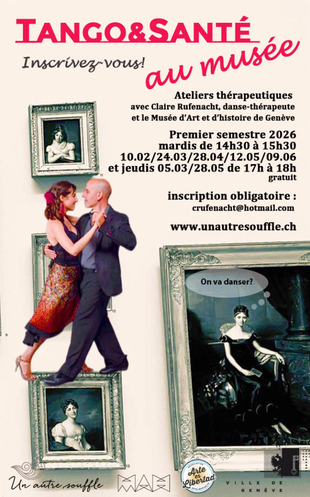 Deprecated shortcode. Use Le Musée d’art et d’histoire de Genève (MAH) ouvre ses portes aux ateliers thérapeutiques « Tango&Santé » en automne 2025: un cadre exceptionnel pour bénéficier d’ateliers thérapeutiques mêlant la danse du tango argentin et la découverte d’oeuvres d’art. Ils s’adressent aux personnes souffrant de troubles neurologiques (Parkinson, Alzheimer, post-AVC et autres maladies du mouvement) et leurs proches-aidants. Inscription obligatoire: INFOS Concert dansant par: Alejo de los Reyes et Paula Serrano, à l’Espace Grosselin Le Musée d’art et d’histoire de Genève (MAH) ouvre ses portes aux ateliers thérapeutiques « Tango&Santé » en automne 2025: un cadre exceptionnel pour bénéficier d’ateliers thérapeutiques mêlant la danse du tango argentin et la découverte d’oeuvres d’art. Ils s’adressent aux personnes souffrant de troubles neurologiques (Parkinson, Alzheimer, post-AVC et autres maladies du mouvement) et leurs proches-aidants. Inscription obligatoire: INFOS …Y su Orquesta quartette en concert et milonga! Caves de Versoix Dans le cadre de la journée des ADEM « Au fil des danses et musiques du monde » sur le Bateau Genève. Le DUO R&R donnera un concert et une démonstration de Tango argentin. Dimanche 14 septembre | Quai Gustave-Ador 1, 1207 Genève Une Práctica est un espace pour danser le tango de manière détendue et confortable. Précédée d’une initiation gratuite au tango de 14h15 à 15h. Le Musée d’art et d’histoire de Genève (MAH) ouvre ses portes aux ateliers thérapeutiques « Tango&Santé » en automne 2025: un cadre exceptionnel pour bénéficier d’ateliers thérapeutiques mêlant la danse du tango argentin et la découverte d’oeuvres d’art. Ils s’adressent aux personnes souffrant de troubles neurologiques (Parkinson, Alzheimer, post-AVC et autres maladies du mouvement) et leurs proches-aidants. Inscription obligatoire: INFOS Cet atelier invite les danseuses et danseurs de tango de tout niveau à explorer la richesse musicale du tango argentin, tant à travers son histoire que dans sa forme, afin d’enrichir sa danse et sa culture. Cours de 18h15 à 19h30 (30.-CHF) Spectacle adapté aux résidents du Foyer du Vallon par le Duo R&R Une Práctica est un espace pour danser le tango de manière détendue et confortable. Précédée d’une initiation gratuite au tango de 14h15 à 15h. instead.Tango&Santé au Musée
